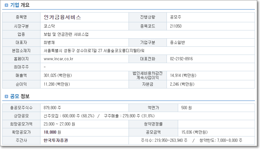 인카금융서비스 청약정보