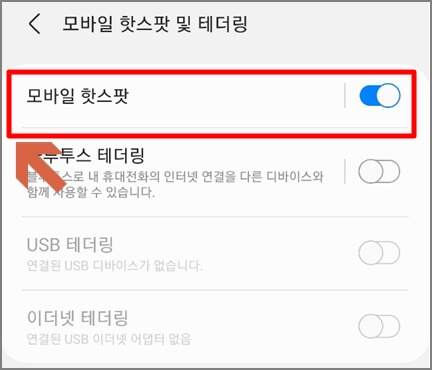 4. 상단의 모바일 핫스팟 부분을 클릭 이동하여 주세요