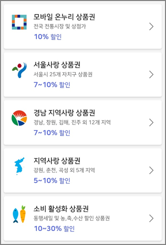 온누리상품권, 서울사랑상품권, 지역사랑상품권을 할인된 금액으로 구매하고 QR/바코드 촬영 및 제시 방식으로 쉽고 간편하게 결제할 수 있습니다!