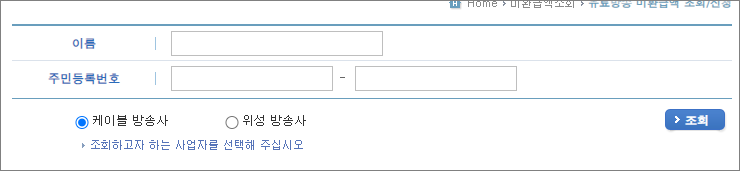 이어서 케이블 방송사와, 위성방송사를 각각 따로 선택하여 주신후에 조회를 할수있습니다. 이름과 주민등록번호를 입력하여 주세요