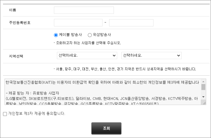 그리고 개인정보 수집에 동의하여야 하고, 본인이 유료방송 미환급액이 존재하는 거주지역을 선택하여 주셔야 합니다.