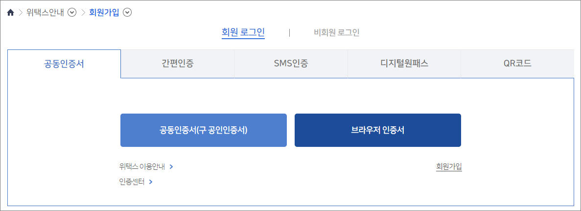여기에서 간단하게 본인인증이 필요하며, 본인인증으로는 공동인증서 SMS문자 인증 카카오톡인증(간편인증) 등의 인증과 디지털 원패스등의 인증으로 인증이 가능합니다.